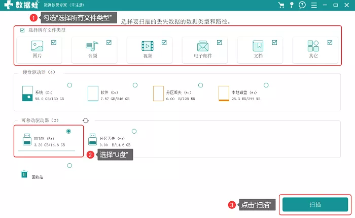 步骤1:确保u盘与电脑连接成功,能识别u盘数据。复制软件链接在官网上下载好,之后打开软件,在扫描界面上,全选所有文件类型和选择u盘(需要u盘与电脑连接成功才能显示)。选择好后,进行【扫描】。