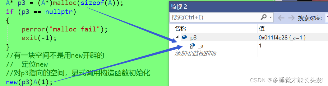 malloc开辟的一块空间,进行显式调用构造函数初始化,这时候p3所指向的空间就可以认为是new开辟的空间,可以delete。如果对malloc开辟的空间没有定向new,也可以delete,但是会有警告。