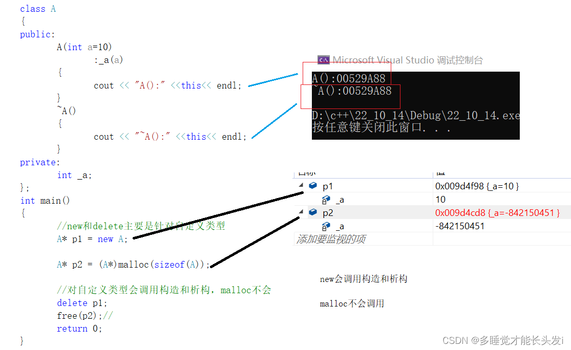 6、申请自定义类型对象时,malloc/free只会开辟空间,不会调用构造函数与析构函数,而new在申请空间后会调用构造函数完成对象的初始化,delete在释放空间前会调用析构函数完成空间中资源的清理。