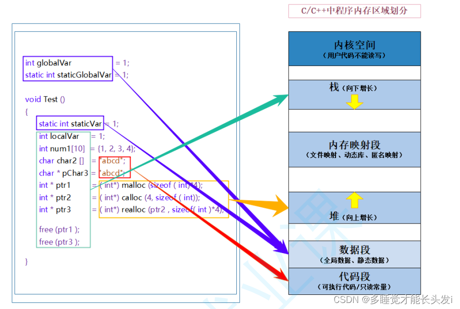 C语言阶段我们学习过C程序内存区域是如何划分的,C++也是这样划分程序的,只不过在使用方式上和C有所不同,我们先复习C,先看几道题目: