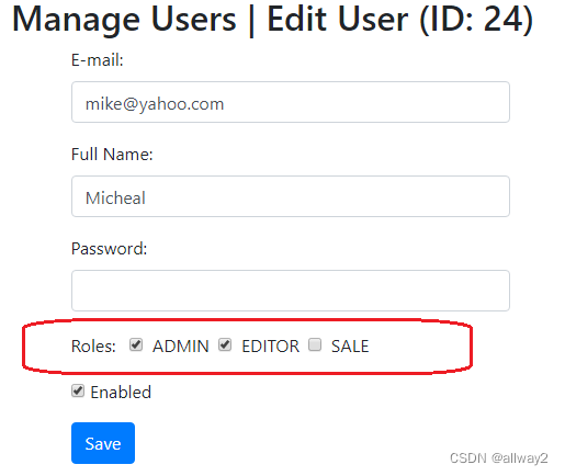 我们不必为保存用户处理程序方法编写任何特殊代码,因为Spring MVC,Thymeleaf和Spring Data JPA在自动持久化User对象和关联角色对象方面做得非常出色。在编辑模式下,它将根据用户和角色之间的关联正确显示复选标记,例如: