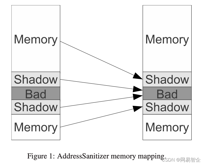 下图显示开启了 asan 后进程的 memory space 的空间布局。Application Memory(图中的 Memory 区域)分为两部分(低和高),映射到相应的 Shadow Memory(图中的 Shadow 区域)。如果对 Shadow Memory 中的地址执行上述映射公式,映射公式保证它输出的地址将位于图中的 Bad 区域,在实现中,通过 page protection 机制将 Bad 区域标记为不可访问从而保证能够及时发现错误。