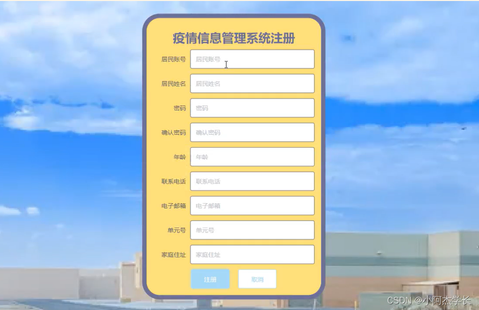 疫情信息管理系统,居民注册在页面填写居民账号,姓名,密码,确认密码,年龄,联系电话,电子邮箱,单元号,家庭住址等内容,进行注册操作;如图5-1所示。