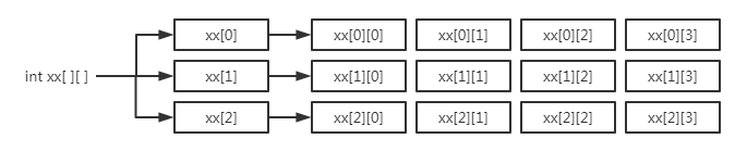 上面的代码相当于定义了一个3*4的二维数组,这个二维数组的长度为3,我们可以将它看成3个int[]类型的一维数组,每个一维数组中的元素又是一个长度为4的一维数组。接下来通过一个图来表示这种情况,如下图所示。