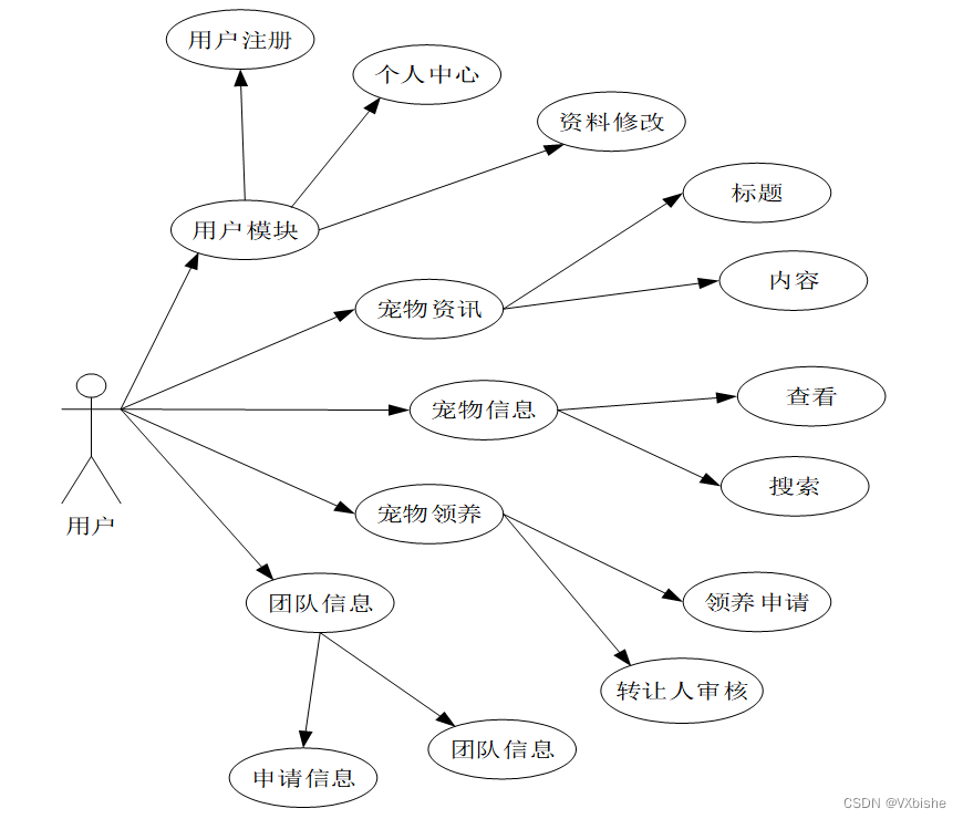 1.普通用户主要使用系统进行宠物领养以及入团申请,下图所示为普通用户的用例