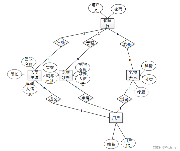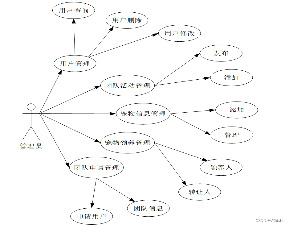 2.管理员主要负责用户管理、宠物信息管理、宠物领养管理、团队信息管理,下图所示描述管理员的用例图。