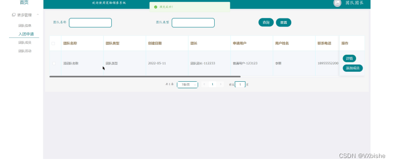 添加入团申请时,会给出数据填写的页面,该页面根据填写好的申请信息同样会事先发送Ajax请求查询申请编号是否已存在,数据填写好之后提交到后台,会调用相关服务在数据库中插入记录。