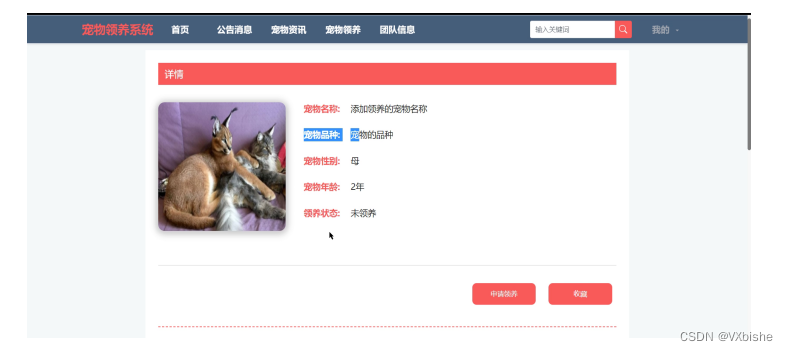 宠物领养:用户可以进行宠物信息浏览,选择自己想要领养的宠物进行领养申请。