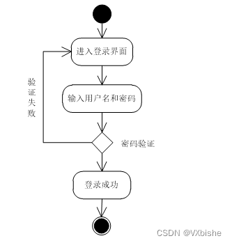 用户可进行登录使用更多功能,首先进入用户登录界面,输入用户账号和密码,后台对账号和密码信息进行核对验证,验证成功则页面直接显示登录用户昵称代表登录成功,否则返回用户登录界面。用户登录活动图如下图。