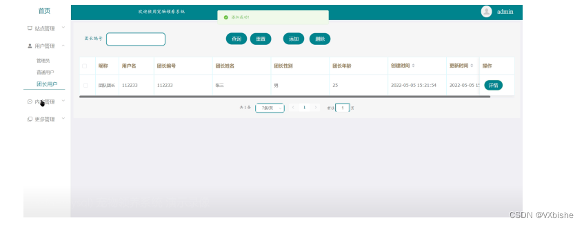 添加团队信息时,会给出数据填写的页面,该页面根据填写好的团队信息同样会事先发送Ajax请求查询是否已存在,数据填写好之后提交到后台,会调用相关服务在数据库中插入记录。