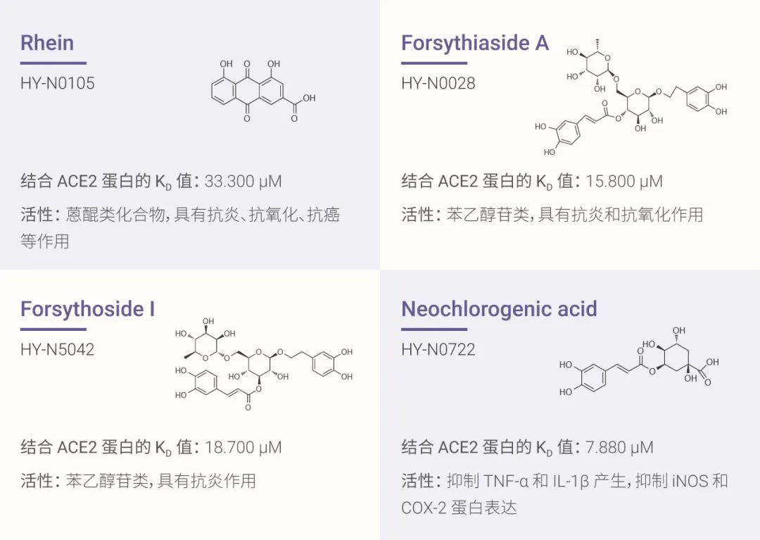 3) 中药如连花清瘟胶囊等;自 2019 年新冠疫情在武汉爆发以来,我国临床医生就使用中药作为辅助疗法治疗 SARS-CoV-2 感染患者,在降低疾病严重程度和住院时间方面取得了显著成功。国家药监局批准,将治疗新冠肺炎纳入金花清感颗粒、连花清瘟颗粒和胶囊等新的药品适应症中。 以连花清瘟颗粒为例:连花清瘟胶囊是由连翘、金银花、大黄、红景天等十三味中药组成,从 2003 年进入市场至今,在抗病毒方面发挥了重要作用。研究表明,其中包含几百张单体成分,其中大黄酸 (Rhein)、连翘酯苷 A (Forsythiaside A)、连翘酯苷 I (Forsythoside I) 和新绿原酸 (Neochlorogenic acid) 通过抑制 ACE2 发挥抑制 SARS CoV-2 感染的作用。