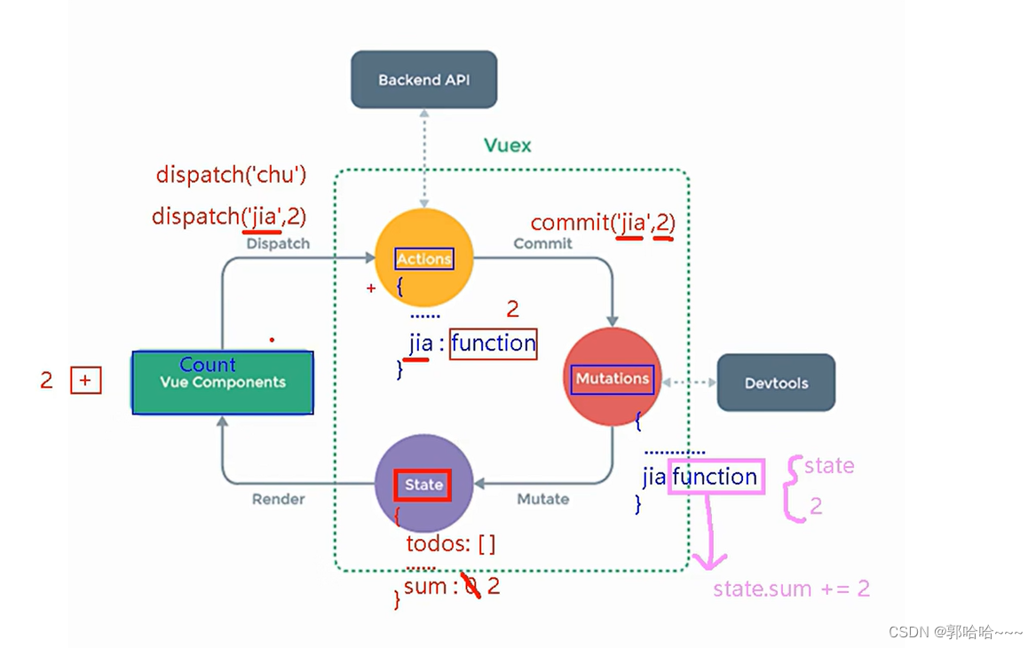 Vuex中有三个东西:Actions、Mutations、State,这些都被store管理着。