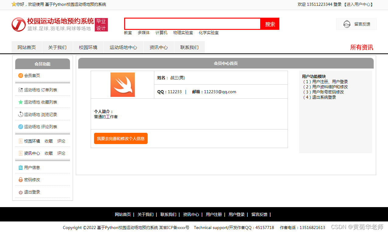 用户信息:姓名、联系方式、邮箱、头像、简介、介绍等,支持随时修改;用户注册的信息后台管理员可见;后台管理员可以删除