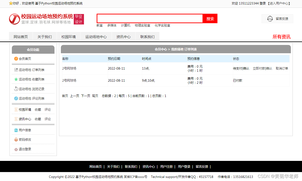 我的运动场地预约订单:显示已经预约的运动场地信息列表,包含运动场地名称,时间,序号等,可以直接点击进入详情页面。