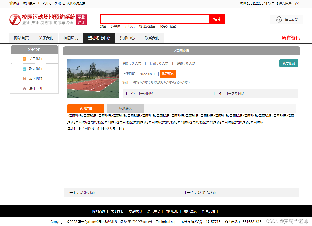 目的:本课题主要目标是设计并能够实现一个基于web网页的校园运动场地预约系统通,整个网站项目使用了B/S架构,基于python的Django框架下开发;管理员过后台添加开放的场地类型(比如羽毛球、篮球、网球等)、录入要开放的场地小时数、管理订单和评论等;前端用户在网站上查看场地信息、在场地预约的时候选择日期、选择要预约的时间点,然后提交。