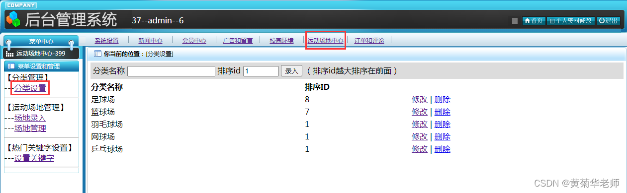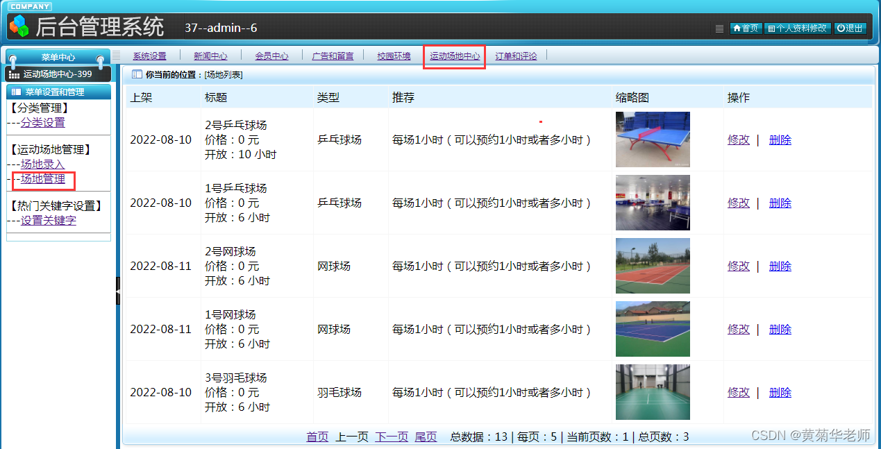 运动场地管理:显示运动场地的列表,支持修改和删除