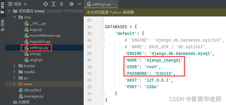 Cms/settings.py 设置数据库和账号,大约在代码第90行左右