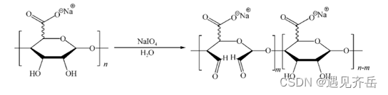 羟基的化学改性涉及氧化、接枝共聚、磺化等,近年来海藻酸钠的氧化受到越来越多关注。氧化工艺中海藻酸钠在高碘酸钠催化下,糖基单元C2—C3断裂,对应的两个羟基氧化生成醛基。还有采用硝酸铈铵/硝酸作为氧化还原引发剂体系,将海藻酸钠与衣康酸通过自由基聚合生成聚海藻酸钠-g-衣康酸。通过优化聚合时间、聚合温度、衣康酸及海藻酸钠的浓度和引发剂用量获得了高得率接枝产物,接枝共聚效率最大能达到 97. 41%。