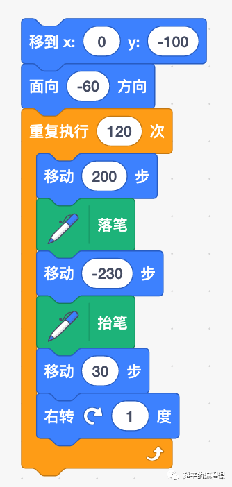 接下来就可以开始绘制了,具体过程也比较简单,就是让小猫沿着-60度方向移动200步,然后反向移动230步,这样第一条直线就绘制完成了,接着继续移动30步,这样小猫就回到旋转点了,此时需要右转1度,重复此过程120次即可,具体的代码如下: