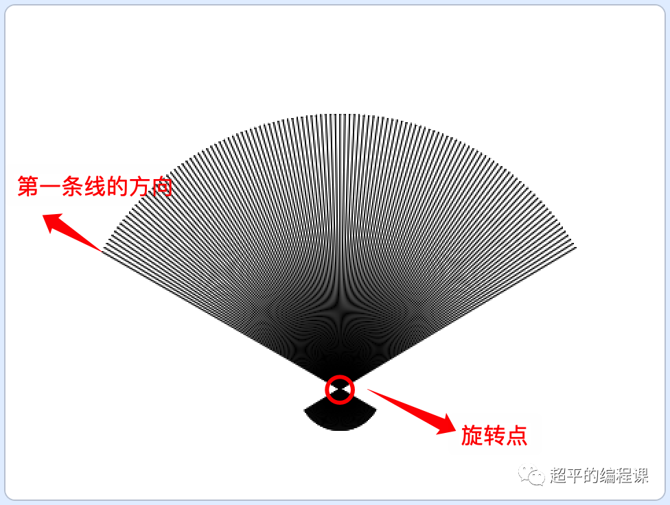 如果将实心圆看成是由360条直线构成的图形,那么这里的折扇则是由120条直线构成。除此之外,它们的旋转点也不一样,对于圆而言,旋转点在直线的中间位置,对于折扇而言,旋转点在靠近扇把的一端,如图:
