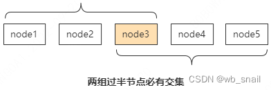 2.两组过半节点必有交集,啥意思呢?我们拿一个5节点的集群来举例,如果每次写入时要求数据同步到至少3个节点,那我任选3个节点,这3个节点中至少有1个节点在前面那同步了最新数据的3个节点中,这是一个有力的保证。比如系统运行一段时间后,leader挂了,剩余节点会重新选举,一个节点能被选为leader的一个条件是,他拥有最新数据,否则就会有数据丢失,选举时要求至少3个节点达成一致,最终这达成一致的3个节点里至少有1个节点含有最新数据