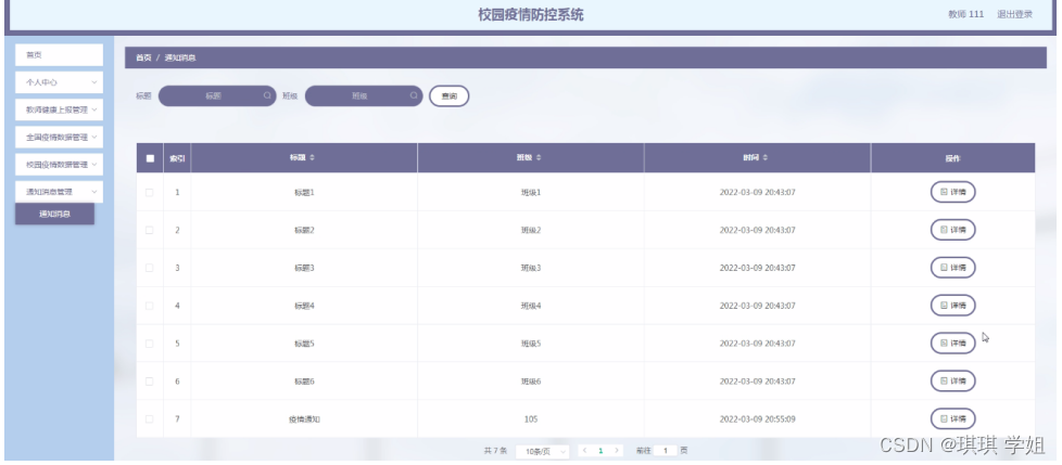 通知消息管理,教师可在通知消息管理页面通过输入标题进行查询等操作,如图5-14所示。