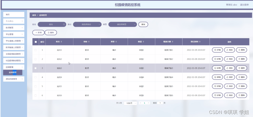 疫情管理,管理员可在疫情管理页面查看姓名、身份、类型、体温、隔离天数、登记时间等内容,还可进行新增、修改或删除等操作,如图5-8所示。