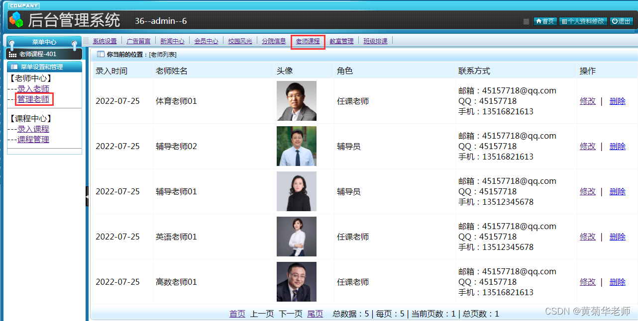 老师管理:管理所有已经录入老师信息,支持修改和删除