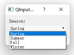 - QString item = QInputDialog::getItem(this, tr("QInputDialog::getItem()"),tr("Season:"), items, 0, false, &ok);