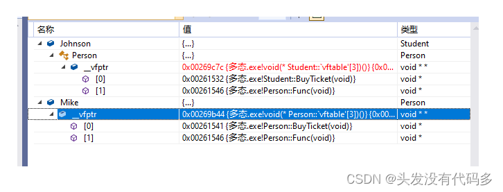 class Person { public: virtual void BuyTicket() { cout << "买票-全价" << endl; } virtual void Func() { cout << "Func()" << endl; } }; class Student : public Person { public: virtual void BuyTicket() { cout << "买票-半价" << endl; } }; void Func(Person& p) { p.BuyTicket(); } int main() { Person Mike; Func(Mike); Student Johnson; Func(Johnson); return 0; }这里父对象和子对象的Func函数地址一样,Buyticket地址不一样,因为Buyticket被重写了