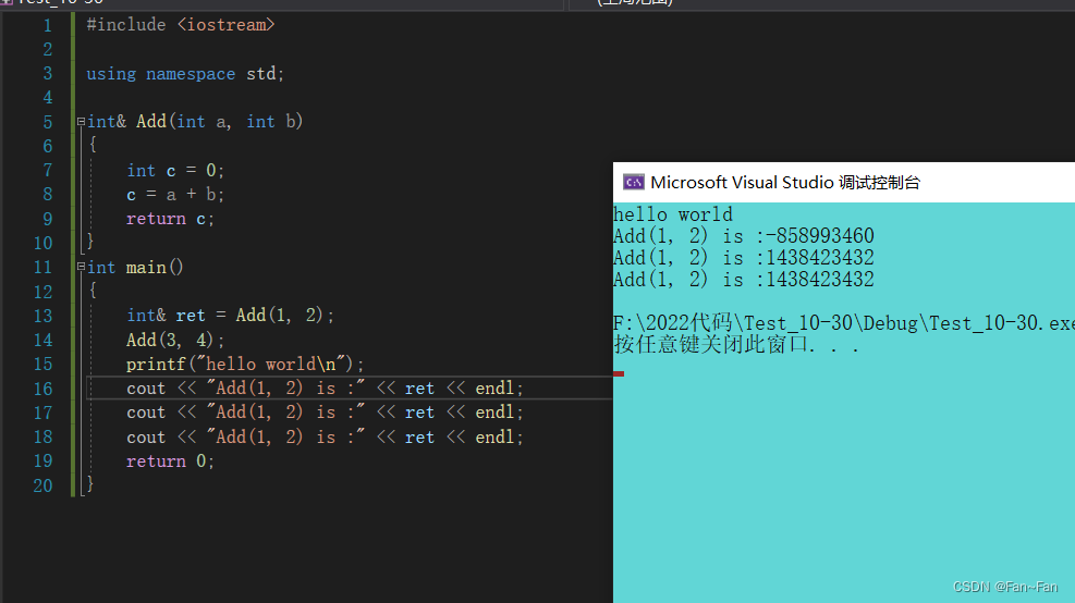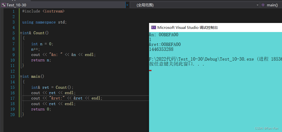 在这段代码中,我们已经给a取别名b,随后把e的值赋给b,这里可不是对e取别名了,通过编译即可看出来,b的地址同引用的a的地址,而不同于e的地址。