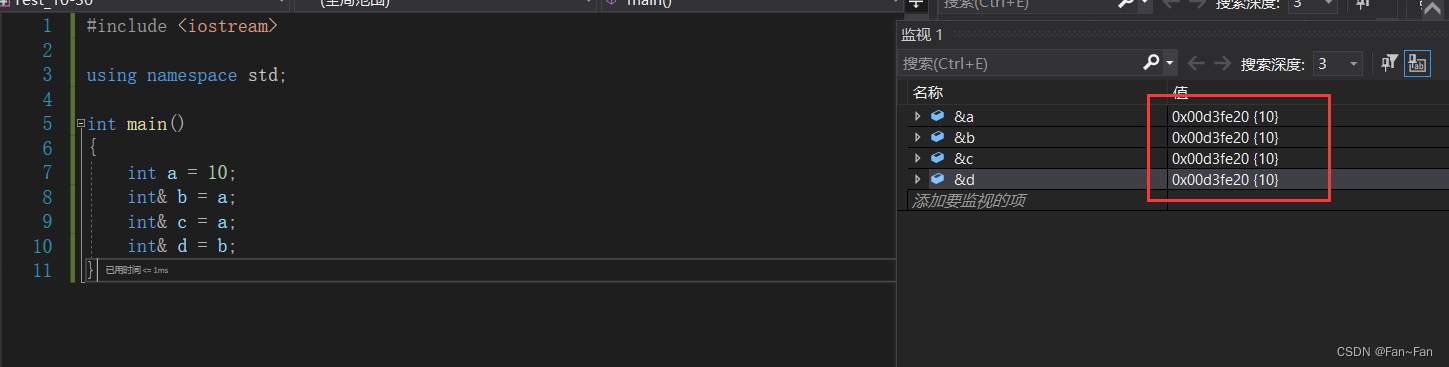上述代码中定义一个变量a,a这块空间占据4个字节,接下来我们又给它取了二个名字叫做b和c,然后又给b取了一个名字叫做d,也就是说a,b,c,d同时可以访问且修改变量a的这块空间,并且a,b,c,d的地址都是一样的。