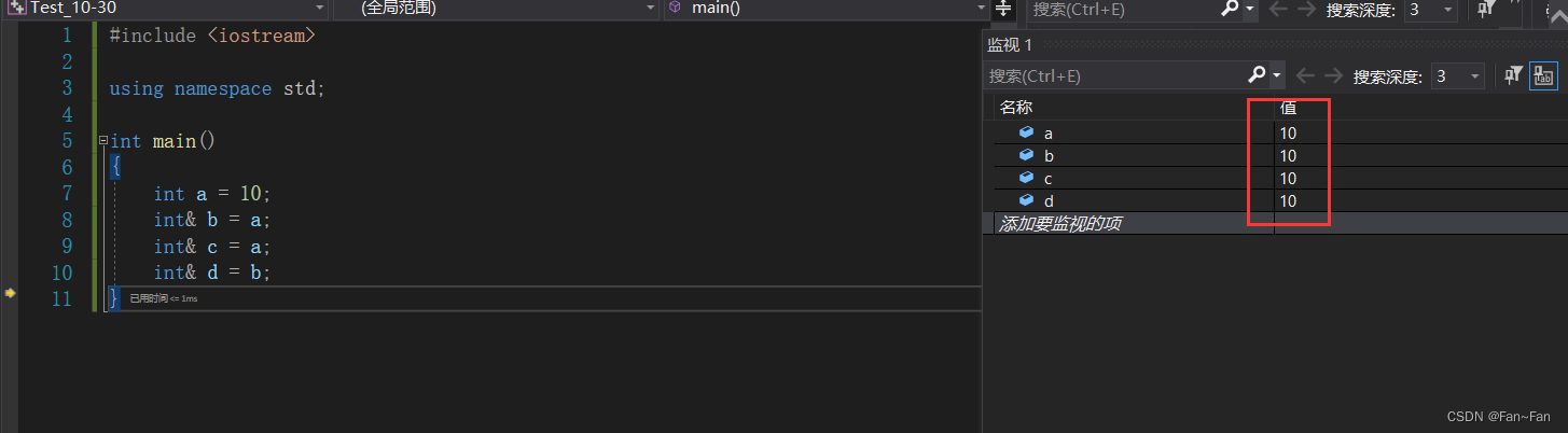 我们可以看到上述方法是错误的,其并没有起到修改的作用。我们注意看范围for的规则:依次取数组中的数据赋值给e这也就说明e是数组中每个值的拷贝,e的改变并不会影响到数组 此时就需要我们用到引用了,当我们给其取别名时,e的修改就会影响到原数组。