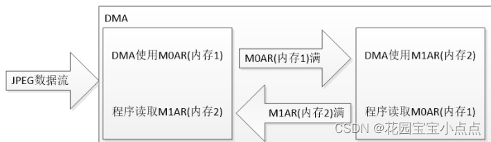 本例程使用DMA的双缓冲机制来读取,DMA双缓冲读取JPEG数据框图如下图: