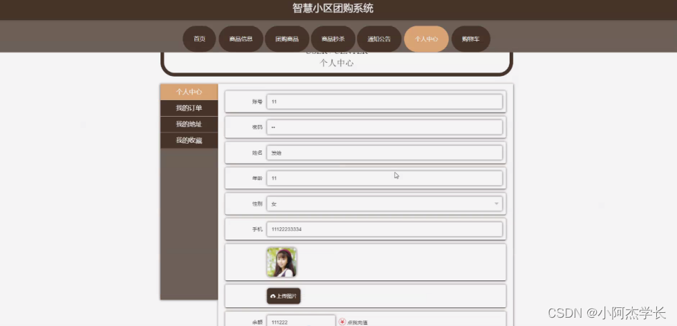 个人中心,用户可在个人中心页面通过输入账号、密码、姓名、年龄、性别、手机、上传图片、余额等内容进行更新信息或查看我的订单、我的地址、我的收藏等内容,如图4-13所示。