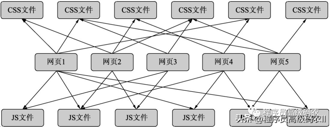 很多人可能会认为,前端是天然按照单个网页解耦的,混乱是可以控制在一定范围内的。但是,前端工程除了网页标签以外,往往还有CSS样式文件和JavaScript脚本文件,这些文件是可以无限制地被多个网页引用的。混乱的前端结构如图3.16所示。