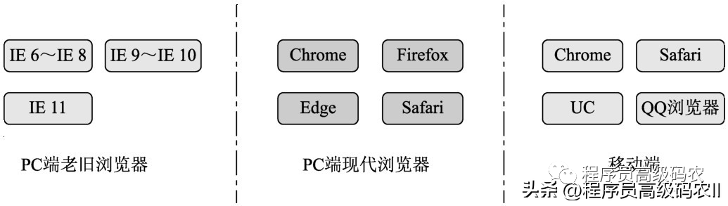 因此,前端架构也应该考虑浏览器的兼容性。网页需要适配的多种浏览器如图3.18所示,这里忽略了一些用户量不大或者没有独立浏览器内核的浏览器,如360浏览器、搜狗浏览器、百度浏览器、小米浏览器、华为浏览器等。