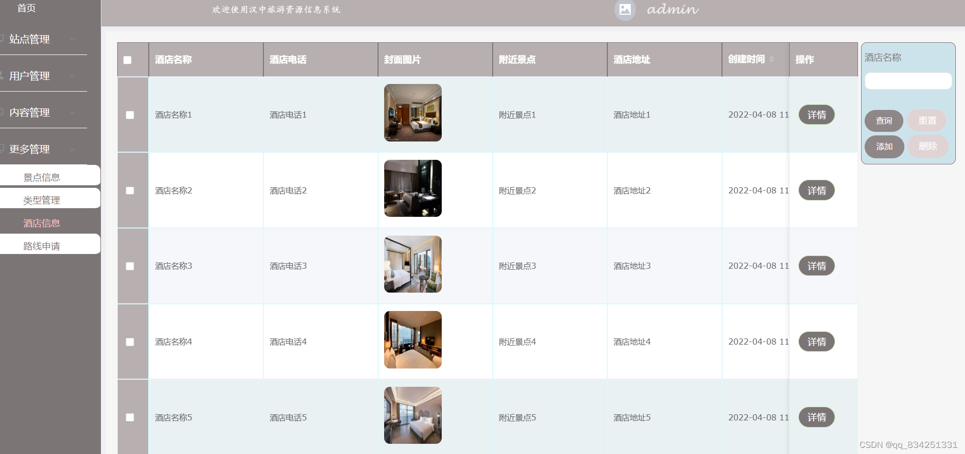 酒店信息管理:对酒店信息进行详情,删除、修改信息。