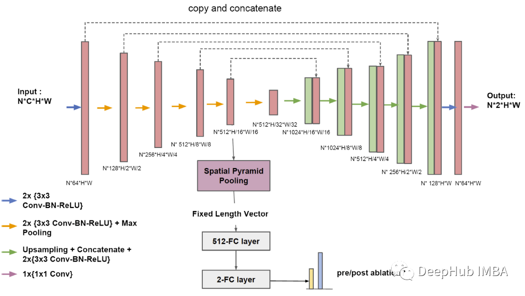 分类任务是利用从下采样路径学习到的图像特征来执行。通过提取第4个池化层之后的特征,从不同大小和尺度的输入图像中学习到固定长度的特征向量,应用了SPPNet中的空间金字塔技术,然后通过2个全连接的层处理向量,使用softmax计算每个图像的类概率(消融前/消融后)。在FC层上使用0.5的Dropout。