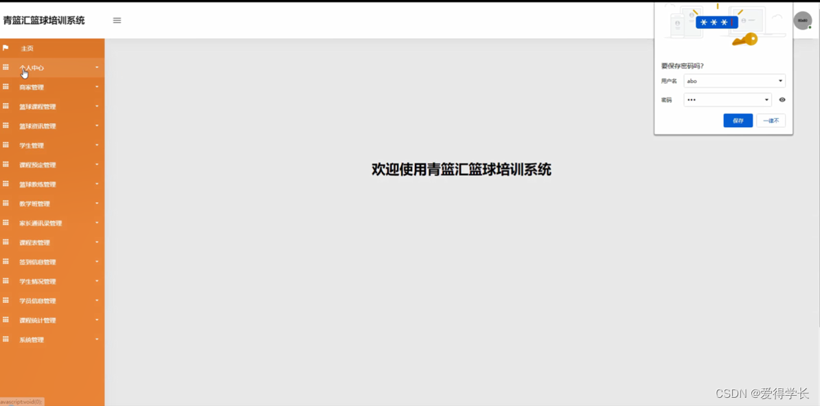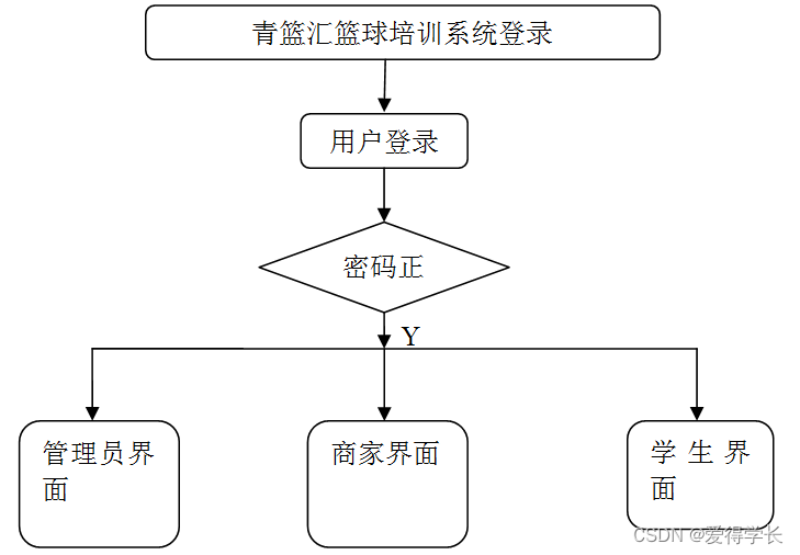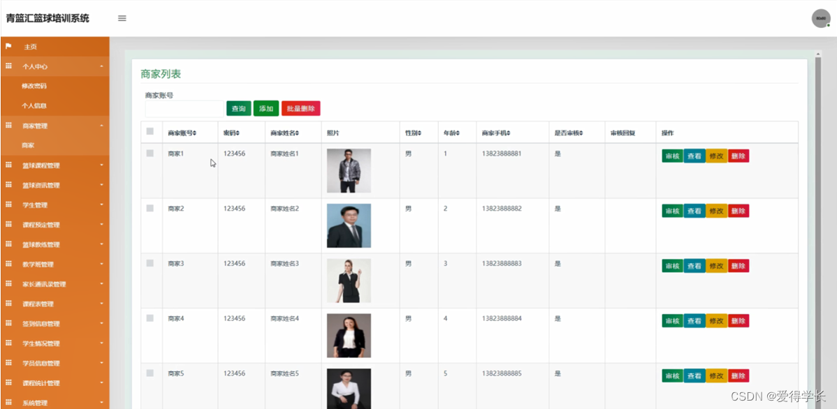 模块包括主界面,主页、个人中心、商家管理、篮球课程管理、篮球资讯管理、学生管理、课程预订管理、篮球教练管理、教学班管理、家长通讯录管理、课程表管理、签到信息管理、学生情况管理、学员信息管理、课程统计管理、系统管理等进行相应的操作。