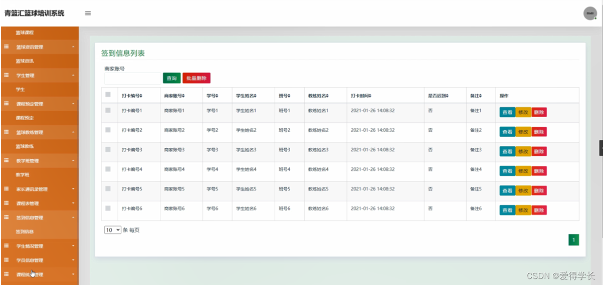 签到信息管理,在签到信息管理页面中可以查看打卡编号、商家账号、学号、学生姓名、班号、教练姓名、打卡时间、是否迟到、备注等内容,并且根据需要进行修改或删除等操作,如图5-8所示。
