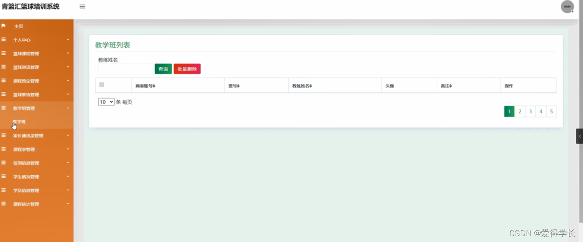 教学班管理,在教学班管理页面中可以查看商家账号、班号、教练姓名、头像、备注等信息,如图5-6所示。