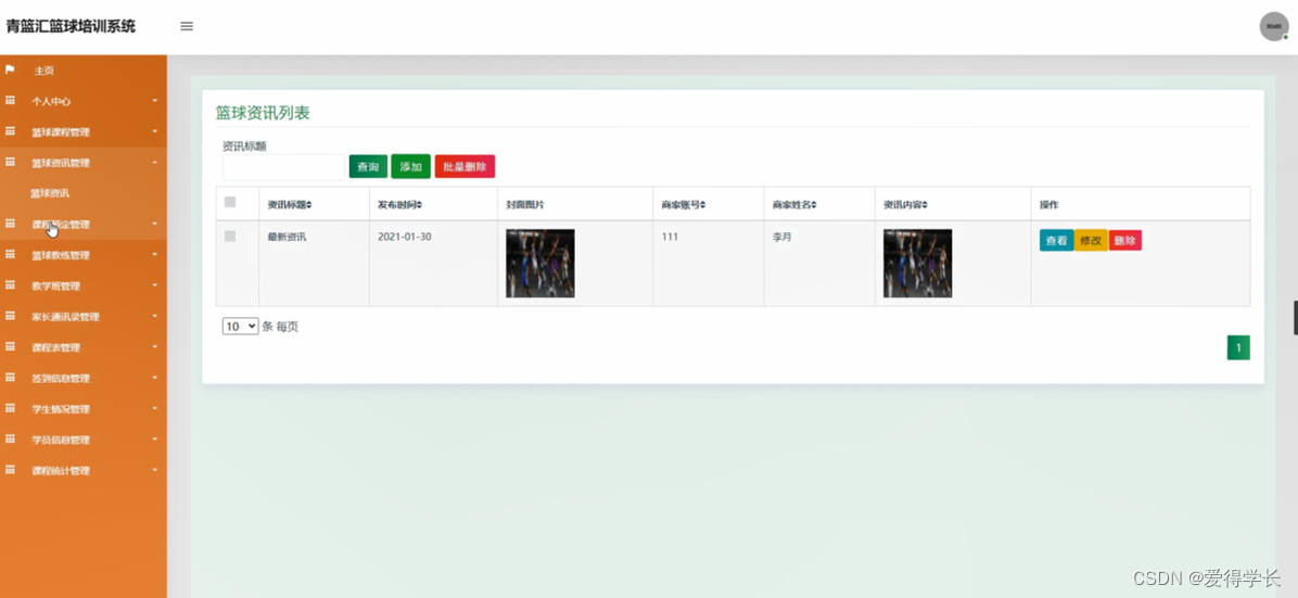 篮球资讯管理,在篮球资讯管理页面可以查看资讯标题、发布时间、封面图片、商家账号、商家姓名、资讯内容等信息,根据需要进行修改或删除等详细操作,如图5-11所示。