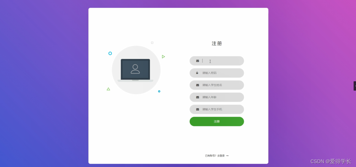 注册,在注册页面通过填写学号、密码、学生姓名、年龄、学生手机等信息完成学生注册,如图5-2所示。