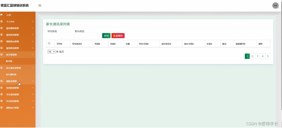 家长通讯录管理,在家长通讯录管理页面中可以查看学号、学生姓名、性别、年龄、头像、学生手机、家长姓名、家长手机、关系、备注、商家账号等信息,如图5-7所示。
