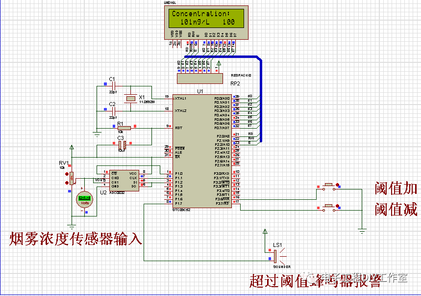 采用51单片机作为CPU,ADC0832作为AD转换模块,LCD1602显示当前采集的烟雾浓度数值,通过按键可以调节上限阈值,并且阈值显示在LCD1602上面,如果测量烟雾浓度大于当前设置的上限阈值,蜂鸣器进行报警提醒,采用电位器可以调节当前烟雾浓度,改变LCD1602烟雾浓度显示值,全套仿真资料齐全: