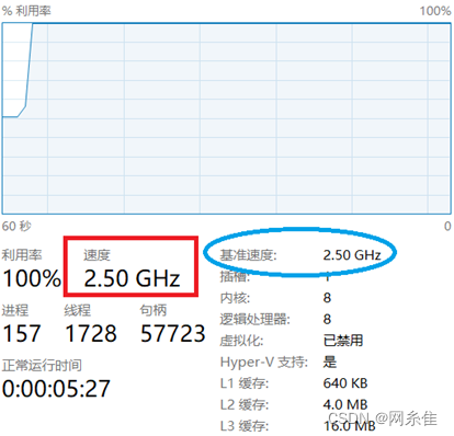 例如,图1为开启睿频技术时,CPU繁忙态的CPU处于4.69GHz的高频率状态;图2为关闭睿频技术时,即使CPU处于繁忙状态CPU仍然按基准频率2.5GHz运行。