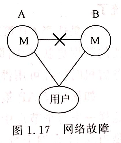 图1. 14中的Consistency(一致性)指的是用户在执行完(一致性)更新操作成功并返回客户端后,所有节点在同一时间能够查询到的数据会保持完全一致,这就是分布式的一致性。例如,在A、B节点下现有某条数据记录值为M,用户向A发起一个写操作,将M更改为N,接下来,用户在执行读操作时,取数据时就会得到N,这就叫一致性。用户还有可能向B节点发起读操作,由于B节点中的值没有发生变化,因此返回的还是M,A节点和B节点读操作的结果不一致,这就不满足一致性了,如图1. 15所示。