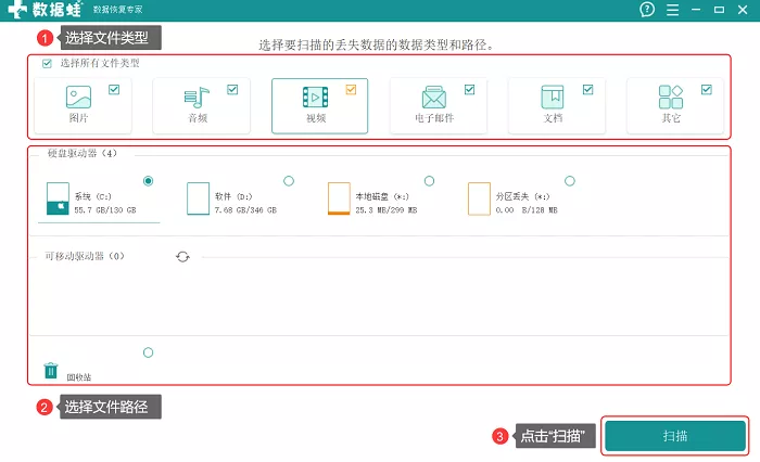 第一步:在软件首页选择所有文件类型(这是为了扫描结果更加全面),再选择你要恢复硬盘文件所在的路径(硬盘驱动器、可移动驱动器、回收站),根据你的实际情况来选择。最后点击【扫描】。