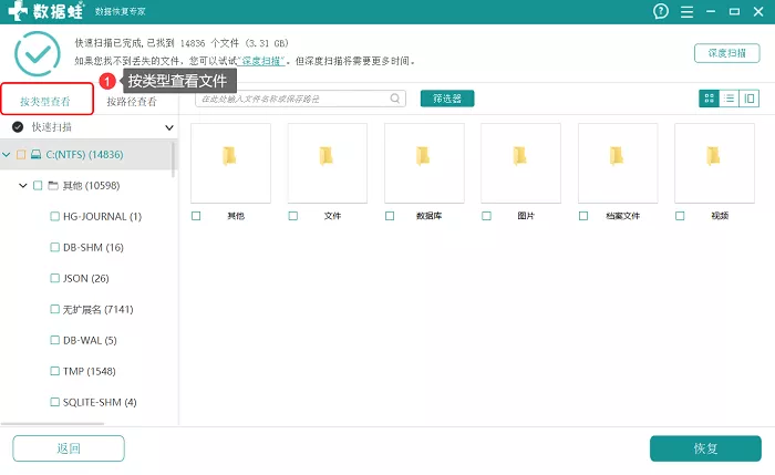 第二步:在快速扫描结果出现后,选择路径来查看文件。比如点击【按类型查看】,这样会更加容易查看。下面会展开一系列的文件内容,查看有没有你要恢复的文件数据。除此之外,你也可以点击【按路径查看】。
